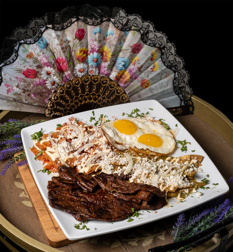 Chilaquiles with Carne Asada - Red, Green,