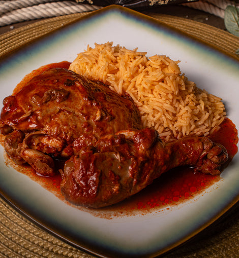 Barbacoa de Pollo estilo Veracruz. Cocinada al vapor con un Guiso de Chiles Secos (No picantes), acompañado de Arroz Blanco o Rojo.