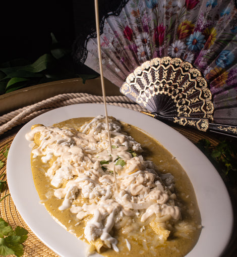 Enchiladas rellenas de Queso, Pollo o Carne Molida. Cubiertas con Salsa Cremosa (Poblana, No Picante) aderezadas con Crema, Queso Fresco y Cebolla.