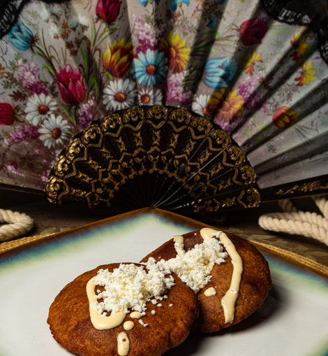 Gorditas de masa dulce y frijoles fritas, estilo Veracruz. Cubiertas de Mole o Queso. (Salsa opcional)