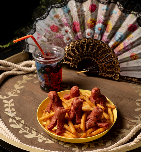 Combo infantil de salchichas con forma de pulpos, papas fritas y bebida.