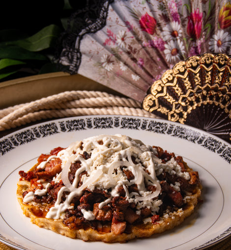 Tortilla pellizcada preparada con 4 Carnes (Lomo, Carne Asada, Chorizo y Chuleta Ahumada) o con la carne y base de su preferencia. Cubierta con Crema, Queso y Cebolla. Salsa Roja / Salsa Verde / Frijoles / Mole.
